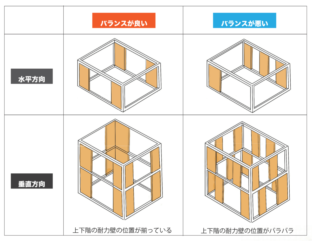 「どの壁を補強するか」は、耐力壁(水平方向に抵抗する壁)の量だけでなく配置バランスが重要です。偏った位置だけを強くすると、地震時に建物がねじれやすくなるためです。平面上のバランスだけでなく、上階から下階へと力をスムーズに伝えるために、垂直方向(上下階)の耐力壁の位置を揃えることも重要です。(図1)