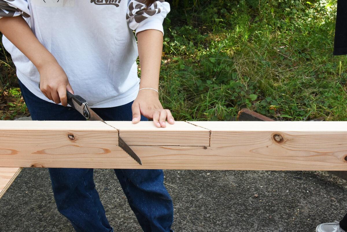 写した線に沿って筋交い材をカットします。筋交いの墨出しは、この工程の中でも精度が求められるポイントです(写真8)。