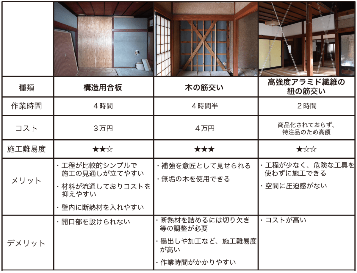 耐震補強と一言で言っても、方法はいろいろあります。今回は次の3つの方法を試しました(表1)。これ以外にも、コボットシステムという耐震補強金物を用いる方法もあります。