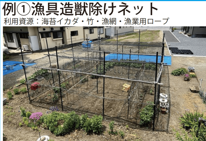 具体的な制作物を見ると、漁具を再利用した獣害対策や畑作業のための東屋、海辺の作業場のように少し大掛かりな制作物もあれば、ベンチや植木鉢のようなちょっとした制作物もある。浦戸では、特に漁業で活用していた道具や資源類が再利用される場合が多く、海苔イカダで利用されていた鉄パイプや竹、漁業用ロープが良く利用されている。これは生産活動による役割を終えたものや廃業に伴い生じたものが保留されているためである。