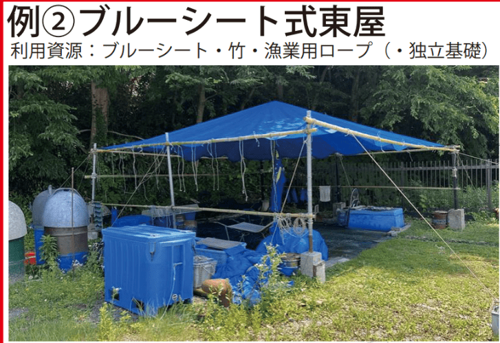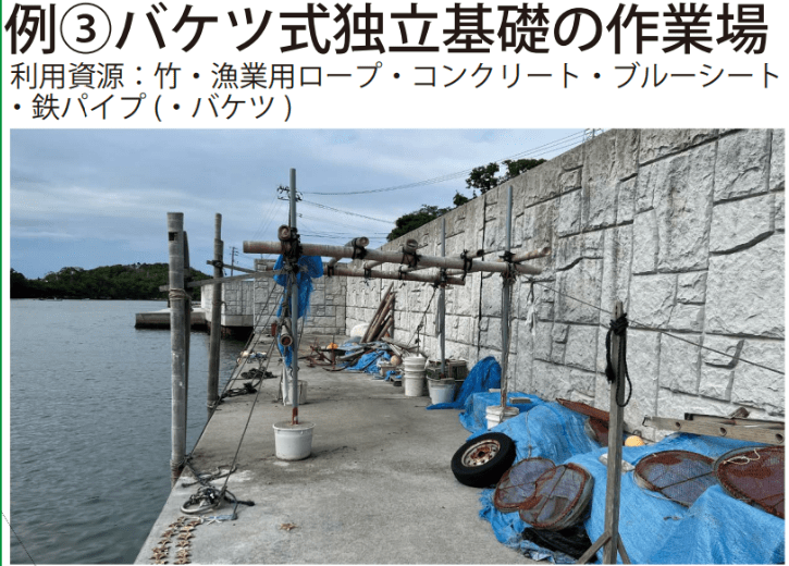 資源のn次利用の一例。①漁具を用いた獣害除けネット/②ブルーシートや竹で建てられた東屋/③バケツにコンクリートを流し込んで基礎とした作業場