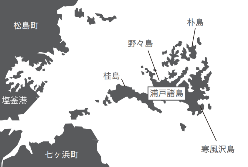 このうち塩竈市に位置する浦戸諸島は、4つの有人島(寒風沢島、野々島、桂島、朴島)から成る離島群である。日本三景の一つ「特別名勝松島」を形成する景観に含まれ、特別保護地区、第1種保護地区、第2種保護地区に指定されている。
