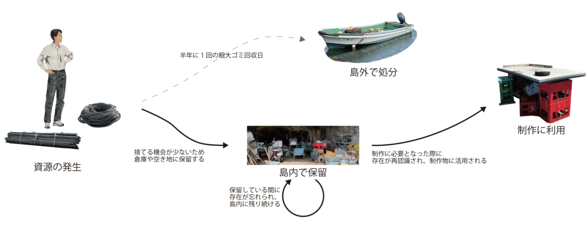 どういうことかというと、まず島内には、捨てられる機会の少ない不用品を暫定的に保管する場所が倉庫や空き地など各所に存在する。不用品は、そこで「貯蔵」され、処分を保留されているうちに、やがて「ごみ」としての存在を忘却される。そしてついには、生活のふとした場面で、誰かの用に足る資源として再認識され、n次利用される。そうした展開が見られるのである。