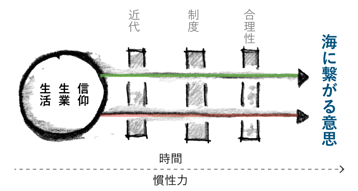 図に示すように、生活・生業・信仰は、それぞれ固有のベクトルをもちながら海へ向かう。そこへ近代化、制度、合理性といった外部の更新が重ね書きされても、地域の行為体系そのものが持つ「慣性力」が、自らの方向を保持し続けている。重要なのは、この慣性力が地域内部から湧き上がり、無意識的・身体的に持続している力であるという点である。