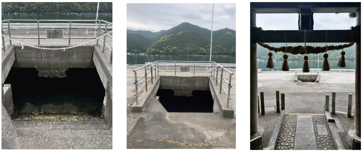 とりわけ漁村では、ハマオリ祭のように神輿や参拝者が浜に下りて海水で清める慣行が各地に見られ、豊漁や航海安全を祈る祭祀と一体となって「海での清め」が神事に関わる行為に組み込まれている。この事例でも海に接続し続ける事由として、参拝前に人びとがこの石段を降りて海水で手を洗い、身を清めてから参拝していた行為を、その延長線で、海と神社を直接むすぶ清めの機能がそのまま造形として現れる。