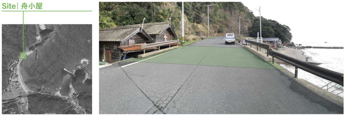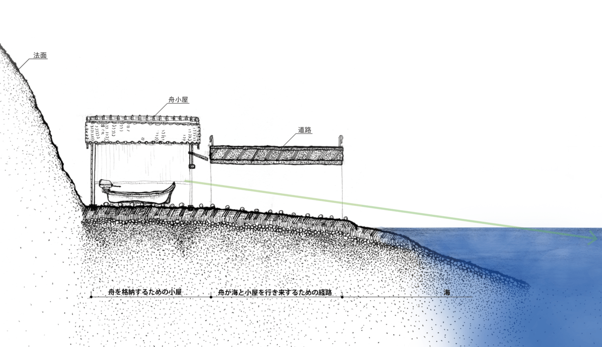 その「海との直結性」を断ち切るように、海岸線の上に新たな道路が敷設された舟小屋がある。道路は浜を横断する水平な帯として、舟小屋の屋根よりも高い位置に通されており、かつて舟の通り道でもあった浜は、防潮壁と舗装路面へと変換されてしまっている。