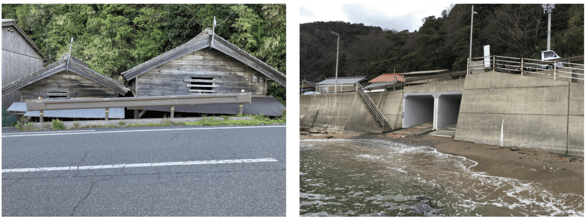 この事例では、舟小屋は道路地盤の下を穿ち抜き、海側のコンクリート護岸の脚部には、舟一艘が通れる幅と高さを確保した矩形断面のトンネルを造り出している。写真の構造物に見られるように、そのトンネルは波打ち際に直接開放され、舟が小屋から真っ直ぐに滑り降り、そのまま海へ出られるように設計されている。道路の舗装面は、近代的表層であり、その直下には、舟小屋と海を結ぶローカルな動線がもう一つのレイヤーとして力強く存在している。