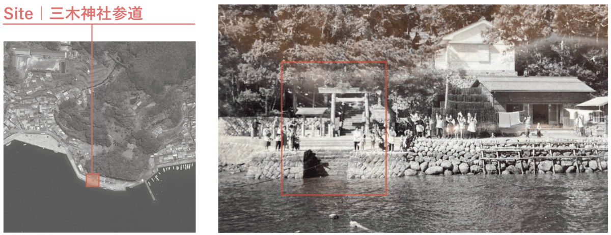 三木神社は、山裾の社殿から海へ向かって一直線に参道軸が伸びる構成をもつ。古写真に写るように、かつての参道は社殿から石段を降り、そのまま海へ入り込んでいる。石積みの護岸は低く、最後の数段は直接海水に浸かりうる高さにあり、まさに「海へ降りていく参道」として機能していたことが分かる。