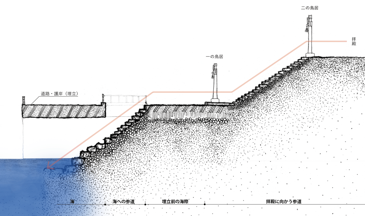 井戸の垂直的な穿ち込み、舟小屋の水平動線を守るための道路下のトンネル、そして参道が護岸を切り欠き海へ降り続ける構造。これらはいずれも、生活・生業・信仰が本来的にもつ方向づけが、近代的合理性や制度的配置の上書きに対して「穿った」結果である。